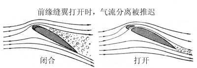 在前緣縫翼閉合時(即相當于沒有安裝前緣縫翼),隨著迎角的增大,機翼上表面的分離區(qū)逐漸向前移,當迎角增大到臨界迎角時,機翼的升力系數(shù)急劇下降,機翼失速。當前緣縫翼打開時,它與基本機翼前緣表面形成一道縫隙,下翼面壓強較高的氣流通過這道縫隙得到加速而流向上翼面,增大了上翼面附面層中氣流的速度,降低了壓強,消除了這里的分離旋渦,從而延緩了氣流分離,避免了大迎角下的失速,使得升力系數(shù)提高。