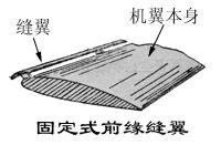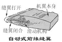 w 自動式前緣縫翼:自動式前緣縫翼用滑動機構(gòu)與機翼相連,它可以根據(jù)迎角的變化而自動開閉。在小迎角情況下,空氣動力將它壓在基本機翼上,處于閉合狀態(tài);當迎角增大到一定程度,機翼前緣的空氣動力變?yōu)槲,將前緣縫翼自動吸開。自動式前緣縫翼的優(yōu)點是顯而易見的,目前應用十分廣泛。
