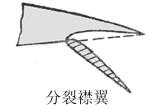 分裂襟翼:分裂襟翼(也稱為開裂襟翼)象一塊薄板,緊貼于機(jī)翼后緣下表面并形成機(jī)翼的一部分。使用時放下(即向下旋轉(zhuǎn)),在后緣與機(jī)翼之間形成一個低壓區(qū),對機(jī)翼上表面的氣流有吸引作用,使氣流流速增大,從而增大了機(jī)翼上下表面的壓強(qiáng)差,使升力增大。除此之外,襟翼下放后,增大了機(jī)翼翼型的彎度,同樣可提高升力。這種襟翼一般可把機(jī)翼的升力系數(shù)提高75%~85%。