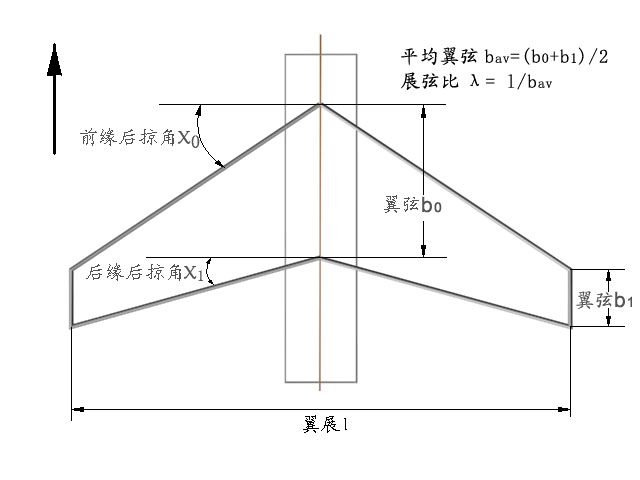 機翼的主要參數(shù)有翼展l、翼弦b、前緣后掠角χ、展弦比λ等(如圖所示)。翼展是指機翼左右翼尖之間的長度;翼弦是指機翼沿機身方向的弦長,除了矩形機翼外,機翼不同地方的翼弦是不一樣的;前緣后掠角是指機翼前緣與機身軸線的垂線之間的夾角;展弦比λ是翼展l和平均翼弦的比值。