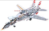 圖中是F-14A“雄貓”艦載超音速戰(zhàn)斗機的解剖圖,可見變后掠翼由固定的內(nèi)翼和可動的外翼組成,二者用轉(zhuǎn)動樞紐聯(lián)接。此外機翼前面還增設了可伸縮的小翼,用來改善變后掠翼的操縱性。在飛行中,F(xiàn)-14A的機翼前緣后掠角可以從20度變到68度;而在艦上停放時,后掠角最大可達75度,可以減少在航空母艦上所占的面積。此外,由于在航空母艦上起飛和著陸距離較短,因此要求艦載機有良好的起飛著陸性能,否則就要一頭扎進大海了,F(xiàn)-14A采用變后掠翼技術正好能滿足這一要求。