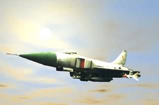 武器裝備:一門23毫米雙管機(jī)炮,備彈200發(fā)。機(jī)翼下共有4個(gè)外掛點(diǎn),可掛裝AA-3“阿納布”紅外制導(dǎo)或雷達(dá)制導(dǎo)空對(duì)空導(dǎo)彈、“蚜蟲”紅外制導(dǎo)近距空對(duì)空導(dǎo)彈、其它武器或副油箱。