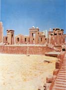 珀賽玻里斯宮(Palaus of Persepolis)(是其中最著名的一所。公元前518-前460年,波斯王大流士和澤爾士所造的宮殿。建筑群倚山建于一高15米,面積460×275米的大平臺(tái)上。入口處是一壯觀的石砌大臺(tái)階層,寬6.7米,鄰近兩側(cè)刻有朝貢行列的浮雕,前有門(mén)樓。中央為接待廳和百柱廳,東南面為宮殿和內(nèi)宮,周?chē)蔷G化和涼亭等,布局整齊但無(wú)軸線關(guān)系。伊朗高原盛產(chǎn)硬質(zhì)彩色石灰?guī)r,再加上氣候干燥炎熱,所以建筑多為石梁柱結(jié)構(gòu),外有敞廊。