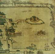 北宋著名別苑,又名西池、教池,位于宋代東京順天門外,遺址在今開封市城西的南鄭門口村西北、土城村西南和呂莊以東和西蔡屯東南一帶。金明池始建于五代后周顯德四年(957),原供演習(xí)水軍之用。宋太平興國(guó)七年(881),宋太宗幸其池,閱習(xí)水戰(zhàn)。政和年間,宋徽宗于池內(nèi)建殿宇,為皇帝春游和觀看水戲的地方。金明池周長(zhǎng)九里三十步,池形方整,四周有圍墻,設(shè)門多座,西北角為進(jìn)水口,池北后門外,即汴河西水門。正南門為欞星門,南與瓊林苑的寶津樓相對(duì),門內(nèi)彩樓對(duì)峙。在其門內(nèi)自南岸至池中心,有一巨型拱橋──仙橋,長(zhǎng)數(shù)百步,橋面寬闊。橋有三拱“朱漆欄盾,下排雁柱”,中央隆起,如飛虹狀,稱為“駱駝虹”。橋盡處,建有一組殿堂,稱為五殿,是皇帝游樂(lè)期間的起居處。北岸遙對(duì)五殿,建有一“奧屋”,又名龍奧,是停放大龍舟處。仙橋以北近東岸處,有面北的臨水殿,是賜宴群臣的地方。每年三月初一至四月初八開放,允許百姓進(jìn)入游覽。沿岸“垂楊蘸水,煙草鋪堤”,東岸臨時(shí)搭蓋彩棚,百姓在此看水戲。西岸環(huán)境幽靜,游人多臨岸垂釣。宋畫《金明池奪標(biāo)圖》是描述當(dāng)時(shí)在此賽船奪標(biāo)的生動(dòng)寫照,描繪了宋汴梁皇家園林內(nèi)賽船場(chǎng)景。北宋詩(shī)人梅堯臣、王安石和司馬光等均有詠贊金明池的詩(shī)篇。金明池園林風(fēng)光明媚,建筑瑰麗,到明代還是“開封八景”之一,稱為“金池過(guò)雨”。明崇禎十五年(1642)大水后,池園湮沒(méi)。