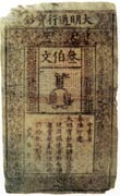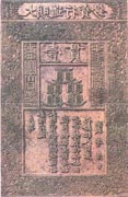 明代在紙幣方面的印刷1368年,明太祖朱元璋滅元建明,即皇帝位,改元“洪武”。于洪武七年(1374年)立鈔法, 設(shè)寶鈔提舉司,并于寶鈔提舉司下設(shè)抄紙和印鈔二局,寶鈔、行用二庫(kù)。從洪武八年 (1375年)起印發(fā)紙幣“大明通行寶鈔”。面額分一百文、二百文、三百文、四百文、五百文、一貫,計(jì)六種。幣值每貫等于一千文或白銀一兩,四貫合黃金一兩。 明代印發(fā)的“大明通行寶鈔”為明代發(fā)行的唯一貨幣,其行用貫串明朝始終。為歷代印鈔史上所獨(dú)有,是明代印鈔事業(yè)之一大特點(diǎn)。洪武二十二年(1389年)戶部又加發(fā)十文至五十文小鈔。同時(shí)一貫的大明通行寶鈔下有“戶部奏準(zhǔn)印造”字樣,當(dāng)為洪武十三年政府廢中書省設(shè)戶部之后印制。此幣票面形式與元幣相似,呈豎長(zhǎng)方形,高一尺,寬六寸,質(zhì)青色,周邊刻有龍紋花欄。票面上方橫書“大明通行寶鈔”六個(gè)大字;中部為面額“壹貫”文及十串鑄錢(十串為一貫),兩側(cè)為“大明寶鈔、天下通行”八個(gè)篆字;下部為豎行楷書“戶部奏準(zhǔn)印造大明寶鈔與制錢通行使用。偽造者斬,造捕者賞銀二百五十兩,仍給犯人財(cái)產(chǎn)。洪武 年 月 日”。票面上蓋“寶鈔提舉司印”兩個(gè)大方紅印。 |