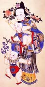 天津楊柳青:地處天津西郊,是中國(guó)北方最早從事雕版印刷年畫的集中地之一。主要采用套色木版水印,然后加工填色,人物面部和衣飾多采用敷粉瀝金加以煊染,可能是受清政府畫院畫法的影響。楊柳青的年畫作坊,大多以人名作為店鋪名字。如初期的戴蓮增年畫鋪、齊健隆年畫鋪較為著名。在年畫印刷最旺盛的時(shí)候,這里聚集著數(shù)百名的畫工和印刷工匠。較大型的作坊,往往雇用幾十名工人,不停地在十多張印刷案臺(tái)上忙碌地工作。每年的秋后,客商云集于此,向各地銷售。