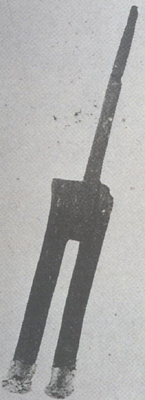 這是一件發(fā)現(xiàn)于湖北江陵紀(jì)南城水井中的戰(zhàn)國(guó)木耒(lěi),其雙齒套有鐵刃。耒是下端雙齒的挖土工具,直至漢代仍延續(xù)使用。