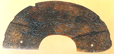 山東蓬萊出土。春秋。玉料呈青褐色,體扁平,半璧形,外緣有對稱的脊牙。一面光素,一面以雙勾飾形態(tài)各異而細(xì)小的簡化夔龍紋。兩端飾龍首,口微張,口角處各有一圓孔,供佩飾。