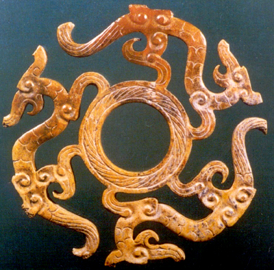 河北平山出土。戰(zhàn)國中晚期。玉料呈黃褐色,半透明。體扁圓,鏤雕而成。兩面紋飾相同。中央一環(huán),內(nèi)外邊緣雕琢突弦紋輪廓周線。環(huán)的表面刻細密陶索紋。環(huán)外雕鏤三條姿態(tài)相同的龍,皆作順時針方向爬行狀。龍獨角,圓眼,回首,張口,曲身翹尾,前后足作卷曲狀。軀體表面雕琢鱗甲紋和云紋。此環(huán)制作工藝難度頗大,雕鏤琢磨極精,堪稱戰(zhàn)國玉器之絕品。