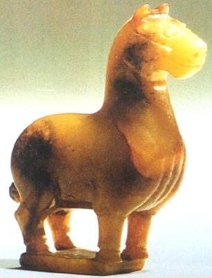 山東曲阜魯國故城出土。戰(zhàn)國。青黃色,局部有紅色斑浸。圓雕。昂首直立,雙豎耳,張目前視,鼻有雙孔。頸部粗圓,前胸突出,體肥膘壯,腿部肌肉清晰,馬蹄分明,前腿直立,后腿微曲,四足立于方座之上。頸鬃突起,尾下垂并打結(jié)。琢磨圓潤,形象生動,是中國較早的玉雕立馬。