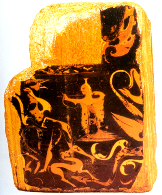 河南信陽長臺關(guān)出土。戰(zhàn)國中晚期。殘片為瑟首的一部分,髹黑漆,其上彩繪射獵圖案。從殘存的畫面可見,一獵者居中,頭戴黃色高頂帽子,裸胸,銀灰色的下衣著地。右手執(zhí)弓,左手張弦,欲射前方一鳥首、細(xì)腰、長腿的怪物。在獵者的周圍還有鹿、龍、云氣等。這幅漆畫既反映出楚國畫工熟練的彩繪技巧,也是戰(zhàn)國早期楚人生活的真實寫照。