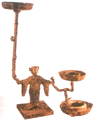 河北平山三汲出土。戰(zhàn)國中晚期。燈為長袍男子形。首系銀質(zhì),兩目嵌寶石。衣上花紋可見朱、黑兩色填漆。其右手握螭,螭口銜柱,柱頂為一燈盤。柱飾錯銀龍紋,繞以浮雕螭龍,并有一猴作攀援狀。左手持螭尾,螭身天橋橫出,口托另一燈盤。螭下方又有燈盤,有螭蟠臥其中,翹首攫噬。人形足下有獸紋方座。此燈所雕的男子,赤手搏持螭龍,當(dāng)有一定神話背景,其面部表情愉悅恬靜,非常生動,發(fā)型也很工整細(xì)致。
