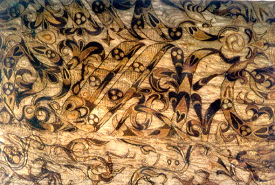 湖北江陵馬山出土。見于蟠龍飛鳳紋繡淺黃絹面衾衾面。單元圖案為長方形。鄉(xiāng)地為淺黃色絹,繪墨稿。繡線可見棕、深紅、土黃、淺黃色。圖案上部是一條作反S形盤旋狀的大龍口銜一條小龍的尾部,小龍作S形,與大龍回首相顧。圖案的下部是一只高冠、展翅而飛的鳳鳥,嘴部與圖案上部大龍的尾部相銜。鳳鳥下部是一條卷曲的小龍。中間有花枝和十字形作為對稱軸。除鳳冠、鳳翅用稀疏的單行鎖繡線填充外,其它部件均為滿繡。圖案構思緊湊、充實,繡線顏色配置協(xié)調,給人以華麗之感。