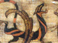 馬山1號墓的錦種類很多,二色錦有塔形紋錦等6種,三色錦有舞人、動物、紋錦等3種。舞人、動物、紋錦的紋樣橫貫全幅,織造時使用143個提花綜,充分反映當(dāng)時已有相當(dāng)先進(jìn)的提花織機(jī)和嫻熟的織造技術(shù)。綈、組、絳是戰(zhàn)國時期出現(xiàn)的絲綢新品種。緯線起花絳和針織絳是戰(zhàn)國絲織技術(shù)的重要創(chuàng)新。馬山1號墓中出土的絳數(shù)量較多。針織絳帶結(jié)構(gòu)復(fù)雜,除橫向連接組織外,還應(yīng)用提花技術(shù),編織方法巧妙,把我國針織技術(shù)起源的歷史提前到公元前三世紀(jì)左右。楚國的刺繡絢麗多彩,代表了楚國絲綢的最高水平。刺繡多以絹為地,以羅為地者也偶有所見。馬山1號墓的21件繡品,花紋各不相同。針法雖比較單一,但鎖扣十分均勻、整齊、線條流暢。較多地運(yùn)用改變線條方向、排列方式、稀疏密度的方法來表現(xiàn)各種禽獸的細(xì)部,突破了單調(diào)、呆板的傳統(tǒng),給人以生動、多變之感。刺繡紋樣的構(gòu)圖講究對稱平衡,動靜結(jié)合,色彩搭配適當(dāng)。圖案的內(nèi)容充滿神話色彩,鮮明反映了楚文化浪漫主義的特色,對后世刺繡的發(fā)展產(chǎn)生深刻的影響。