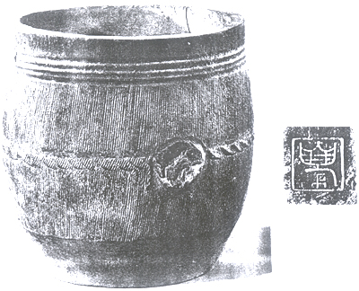 山東鄒縣紀王城出土。戰(zhàn)國。高33.2、口徑30、底徑23厘米,容20000毫升。廣口深腹。腹部有對稱的兩柄,內底有印文“廩”字,當是倉廩中使用的量器。鄒縣在戰(zhàn)國時曾先后屬鄒、魯、莒等國,故難以確定此器國別。鄒、魯、莒與齊國為近鄰,此器容量與齊國一釜相當。