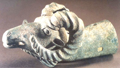 內(nèi)蒙古準格爾旗玉隆太出土。戰(zhàn)國晚期。羊雙角向前盤卷,雙目前視,口微張,額下有長鬚。頸向后伸延成圓形銎,銎側(cè)有兩個釘孔,銎下側(cè)有磨痕。鑄造精致,形象生動逼真。