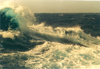 今晨,在45°S,100°E處,有一低壓,中心氣壓值達(dá)975hpa,最大風(fēng)力達(dá)35米/秒,氣溫降到5℃左右,船顛簸甚烈。我到了第四層指揮臺(tái),拍了幾張巨浪的照片,又到第三層氣象室拍了幾張氣象資料。行動(dòng)困難,額外小心。在指揮臺(tái),船長(zhǎng)佐藤一直坐陣指揮。我眺望船頭,但見(jiàn)巨浪翻滾,時(shí)而掀起船頭,時(shí)而把船頭淹沒(méi),時(shí)而船身左傾,時(shí)而右傾。我左手扶把,右手照相,拍下了船在巨浪中前進(jìn)的鏡頭。此時(shí),船的位置正好在44°44′S,109°39′E。