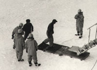 早晨九點(diǎn)許,廣播里突然傳來"はちじゅらさり……"的呼聲,這聲音一般是指艦載的83號(hào)直升飛機(jī)有行動(dòng)。因?yàn),每?dāng)白瀨號(hào)靠岸,直升飛機(jī)運(yùn)載飛行時(shí),往往可以聽到這樣的廣播聲,意即"83號(hào)返航"或"83號(hào)起飛"。我納悶:白瀨號(hào)正在航行中,直升飛機(jī)怎么會(huì)起飛呢?我穿上外衣,上了甲板的左舷,但見甲板四周的欄桿并未放下,表明直升飛機(jī)不會(huì)起飛。我腦海里閃著這個(gè)疑問向停機(jī)場(chǎng)走去。艦長佐藤正好和我相遇。我們相互問好后,我說:"I