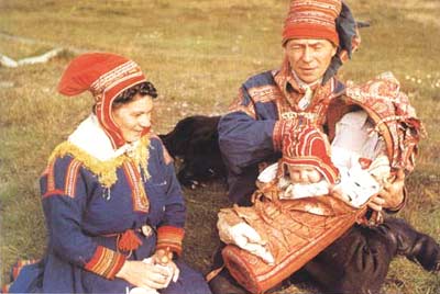著傳統(tǒng)服裝的芬蘭拉普人,圖中的古老搖籃在今天已屬罕見之物