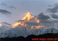 約七點(diǎn)三十五分,我走到江邊的一條小支流旁,正要刷牙,但見加拉白壘峰頂顯出紅光,朝陽升起,分外美麗。我立即丟下牙具,提上像機(jī),直奔雅魯藏布江邊。越接近江邊,越能拍到加峰在江中的倒影。清晨,平靜的江面上倒影著加峰白里透紅的美貌,太動人了!電視臺攝影師徐進(jìn)與我同去刷牙,見此情景,丟下牙具,轉(zhuǎn)身跑回宿舍,扛著攝像機(jī)奔到江邊,忙碌了近一個(gè)小時(shí)。