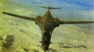 “B1-B”屬變后掠翼超音速遠程戰(zhàn)略轟炸機,1986年裝備部隊,主要執(zhí)行亞音速遠程空中突襲任務,已生產(chǎn)100架以上。它的正常起飛重量為180噸,平飛速度為音速的1.25倍,升限15000米,轉場航程12000公里,戰(zhàn)斗半徑可達7500公里。機內(nèi)可掛裝8枚“AGM-86B”巡航導彈,24枚“AGM-69”空對地導彈和12—24枚核彈。機身外還有6個外掛架,可掛裝12枚“AGM-86B”巡航導彈或其他空對地武器。機身內(nèi)最大載彈量為34噸,機身外載彈量為26.76噸。