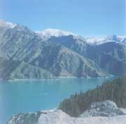 在新疆,經(jīng)緯度N43°53ˊ,E88°08ˊ的地方,烏魯木齊以東的東天山高聳的博格達山上,靜靜的躺著一個當?shù)厝藗儯ú刈遄灾沃荩房悼h)俗稱的“大海子”。那是神話傳說中王母娘娘入浴之池,古稱“瑤池”。又說是王母娘娘梳妝臺上的一面鏡子,清乾隆年間取“天鏡”、“神池”之意,命其為“天池”。為了同東北長白山天池區(qū)別,俗稱“天山天池”或“阜康天池”。