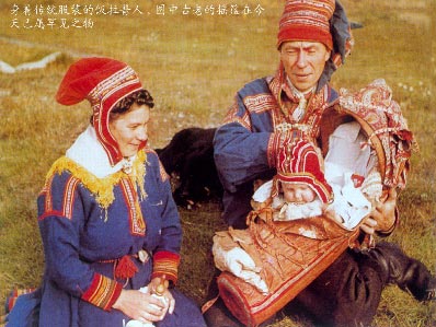身著傳統(tǒng)服裝的挪威拉普人, 圖中古老的搖籃在今天已屬罕見。