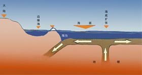 無獨有偶。與島弧的這種有趣的排列相呼應的是,在島弧的大洋一側,幾乎都有海溝伴生。諸如阿留申海溝、千島海溝、日本海溝、琉球海溝、菲律賓海溝、馬里亞納海溝等等,幾乎一一對應,也形成一列弧形海溝。島弧與海溝像是孿生姊妹,形影相隨,不即不離;一島一溝,顯得奇特可貴。其他的大洋也有群島與海溝伴生的現象,如大西洋的波多黎各群島與波多黎各海溝等,在地質構造上也大同小異,不過沒有太平洋西部這樣集中,也不這么突出與典型罷了。如此有趣的安排,不是上帝的旨意,而是大自然的內在力量的體現,是大洋底與相鄰陸地相互作用的結果。