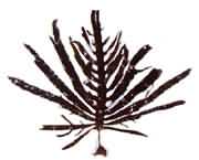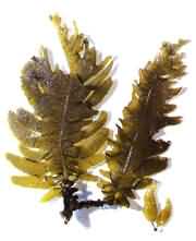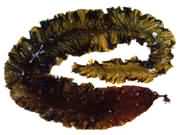藻體褐至黑褐色,葉狀,革質(zhì),高30~40厘米,寬35~45厘米。咋片中部厚,兩側(cè)羽狀分枝,葉緣有粗鋸齒,葉面皺褶,柄部圓柱形,固著器為分枝的假根。生長(zhǎng)于流急浪大的大干潮線以下1~5米的 裙帶菜
