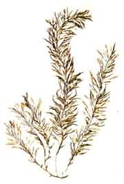 藻體黃褐色,樹狀,枝葉繁茂,高O.5~l米,可達(dá)7米。主枝圓柱形,下部有數(shù)條縱走淺溝,直徑1.5~3毫米。互生、對生分枝,吟片披針形,中肋及頂,鋸齒深裂。柄細(xì)長。氣囊圓柱形,長0.5~l厘米,直徑2~3毫米,兩端尖細(xì),冠吟羽裂, 中肋及頂,固著器裂瓣?duì)睢I惩袌A柱形,有短柄,雄托長4~8厘米,直徑1.5~2毫米;雌托長1.5~3厘米,直徑2~3毫米。生長在風(fēng)浪較大的干潮線以下至3米處的巖石上或低潮帶石沼中。生長盛期3~5月。產(chǎn)于嵊山、中街山、漁山、韭山、大陳和南麂。我國沿海都有分布。本種系北太平洋西部特有的暖溫帶性海藻。可作制膠工業(yè)原料。
