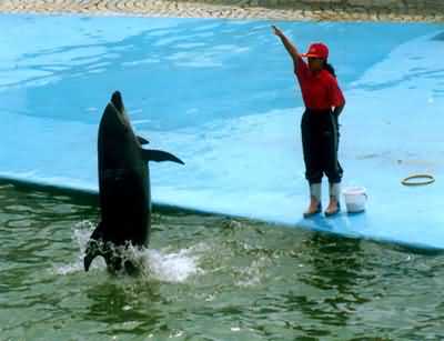在訓(xùn)練人員的引導(dǎo)下,海豚在作精彩表演