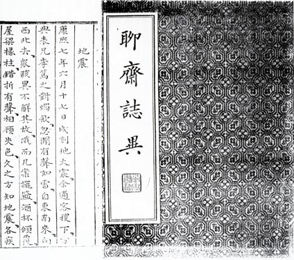 康熙七年六月十七日(公元1668年7月25日)山東莒縣、郯城間發(fā)生8.5級特大地震,聲若轟雷、河水橫溢,城垣民房倒塌一空,計壓死四萬余人。當時蒲松齡正在這次地震的重災區(qū)淄川,作為這次地震的幸存者,震后蒲松齡以《地震》為題,把這次地震的親身經(jīng)歷記錄下來,收編在《聊齋志異》中。