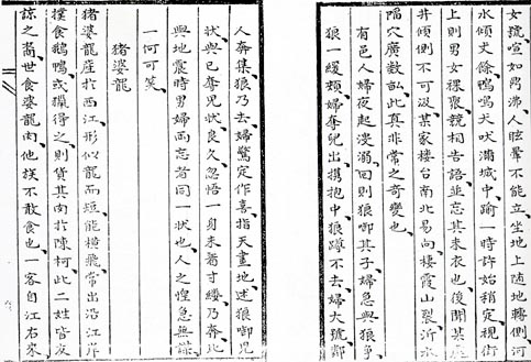 有邑人婦,夜起溲溺,回視則狼銜其子,婦急與狼爭。狼一緩頰,婦奪兒出,攜抱中。狼蹲不去,婦大號,鄰人奔集,狼乃去。婦驚定作喜,指天畫地,述狼銜兒狀,已奪兒狀。良久,忽悟一身未著寸縷,乃奔。