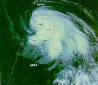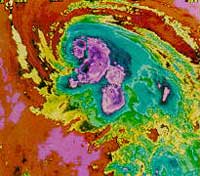 在衛(wèi)星云圖上,臺(tái)風(fēng)由臺(tái)風(fēng)眼、中心稠密云區(qū)和螺旋云帶組成。臺(tái)風(fēng)眼分成大眼、小眼、圓眼和不規(guī)則形狀眼,它可以位于臺(tái)風(fēng)云區(qū)中心,也可位于臺(tái)風(fēng)云區(qū)邊緣。中心稠密云區(qū)邊界越光滑,云型越圓,尺度越大,越稠密,臺(tái)風(fēng)強(qiáng)度越大。臺(tái)風(fēng)云帶越寬,環(huán)繞臺(tái)風(fēng)中心的圈數(shù)越多,強(qiáng)度越大。與臺(tái)風(fēng)相聯(lián)的另一種云帶稱對(duì)流帶。