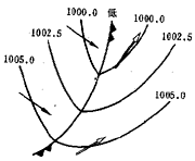 氣壓場:鋒面兩側(cè)是密度不同的冷、暖氣團,因而鋒區(qū)的氣壓變化比氣團內(nèi)部的氣壓變化要大的多。鋒附近區(qū)域氣壓的分布不均勻,鋒處于氣壓槽中,等壓線通過鋒面有指向高壓的折角,或鋒處于兩個高壓之間氣壓相對較低的地區(qū),等壓線幾乎與鋒面平行。