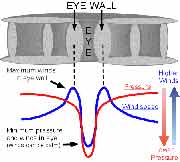 臺(tái)風(fēng)是暖性低壓,因而臺(tái)風(fēng)范圍內(nèi)的地面流場是氣旋式輻合流場。按輻合氣流速度的大小,一個(gè)發(fā)展成熟的臺(tái)風(fēng),其低層沿經(jīng)向方向可分為三個(gè)區(qū)域:(1)外圈:自臺(tái)風(fēng)邊緣到最大風(fēng)速區(qū)外緣,風(fēng)速向中心急增,風(fēng)力在6級(jí)以上,半徑約200-300公里;(2)中圈:從最大風(fēng)速區(qū)外緣到臺(tái)風(fēng)眼壁,是臺(tái)風(fēng)中對(duì)流和風(fēng)雨最強(qiáng)烈的區(qū)域,半徑為100公里;(3)內(nèi)圈:即臺(tái)風(fēng)眼區(qū),風(fēng)速迅速減小,半徑約5-30公里。
