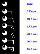 圖中風(fēng)向桿上每一條短劃線代表5Knot,每一條長劃線代表10Knot,將風(fēng)向標(biāo)上所有劃線的值加起來就是風(fēng)速值的大小。右圖給出了風(fēng)向標(biāo)上每種符號所代表的值的大小。