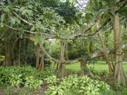 榕樹的很多種類具“板根現(xiàn)象”、“老莖生花”、“空中花園“和”“絞殺現(xiàn)象”等,景觀奇特雄偉,反映了熱帶雨林的重要特征;而一些種類被當(dāng)?shù)孛褡逡暈椤吧瘢垼洹焙汀胺饦洹,形成了?dú)特的民族榕樹文化。榕樹園正是基于它們在滇南熱帶雨林生態(tài)系統(tǒng)中的重要生態(tài)意義,奇特的園林景觀、豐富的民族文化知識和種質(zhì)資源保存等方面的重要性和必要性而建立起來的。該園占地約1公頃,自1993年建園以來收集榕屬植物近60種,根據(jù)榕樹的生活型、生態(tài)習(xí)性將該園分為三個小區(qū):附生絞殺榕區(qū)、地生榕樹區(qū)和榕樹民族植物文化區(qū)。其中,高榕、垂葉榕、菩提樹、鈍葉榕、木瓜榕等已形成“樹包塔”、“榕樂廊”、“獨(dú)樹成林”、“絞殺現(xiàn)象”等景觀,給人們以奇而美的享受。