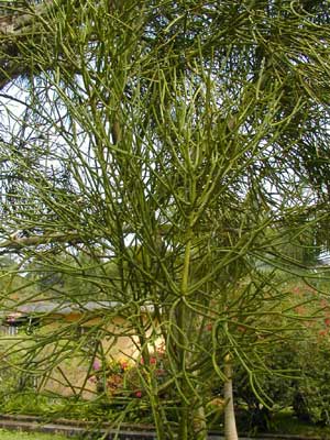 在西雙版納熱帶植物園里,偶爾會遇到一種怪怪的樹:整個樹身不見一片葉子,滿樹盡是光溜溜的碧綠的枝條,若折斷一小根枝條或刮破一點樹皮,就會有白色的乳汁滲出。導(dǎo)游小姐把游客帶到這種樹旁時可能會打趣地說:"這叫光棍樹,沒有結(jié)婚的年青人可不能摸啊,如果摸了就會打一輩子光棍的"。光棍樹因它奇怪的名字和形態(tài),引起人們的好奇。