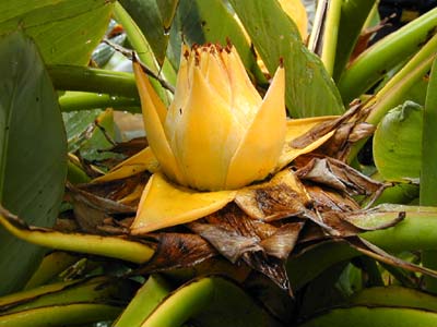 地涌金蓮又名千瓣蓮花,為芭蕉科象腿蕉屬多年生草本植物,原產(chǎn)我國(guó)云南省,四川省也有分布,系我國(guó)特產(chǎn)花卉。地涌金蓮叢生,植株矮小,一般高1米以下。地上部分由葉鞘層層重疊、形成螺旋狀排列,如樹(shù)桿狀,稱之為假莖。葉片濃綠色,長(zhǎng)橢圓形,頂端銳尖,形似芭蕉葉,長(zhǎng)約50厘米,寬可達(dá)20厘米;ㄆ谳^長(zhǎng),可達(dá)250天左右,六枚苞片為一輪,頂生或腋生,金光閃閃,形如花瓣,層層由下而上逐漸展開(kāi),能保持較長(zhǎng)時(shí)間不枯萎,且鮮艷美麗而有光澤,恰如一朵盛開(kāi)的蓮花,而真正的花清香、柔嫩、嬌小,黃綠相間,包藏在苞片里面,苞片展開(kāi)時(shí)才展現(xiàn)出來(lái);又因其假莖低矮而粗壯,先花后葉,于早春開(kāi)花時(shí)忽從地下涌冒而出,悄然綻放,使人驚奇,故有地涌金蓮之稱謂。花卉多以美、香、色取勝,而地涌金蓮以奇壓倒群芳,它不僅花冠碩大,奇美,還有更令人拍案叫絕之處:當(dāng)它生長(zhǎng)旺盛時(shí),在假莖的葉腋中也能開(kāi)出眾多的小花朵,形成“眾星捧月”的奇觀。