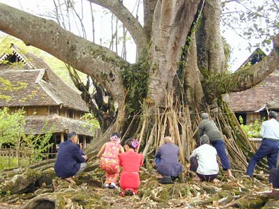 由于人們把高大的樹當成“神樹”崇敬,所以它們都受到各民族的保護。即使是由于建蓋“竹樓”需要砍伐大樹,他們也要先祭樹神,即以蠟條兩對、檳榔一串、酒一盅相祭,以求樹神的見諒,使被砍伐的大樹不至作祟。而作為神樹的大青樹,人們從來不敢砍伐,而且要栽于村寨中或附近,讓其庇護村社的安寧。在歷史上,人們栽種大青樹還要舉行一定的儀式,唱《栽樹歌》:“吉祥啊,圣潔的樹,不栽在高山上,不栽在深箐,就栽在寨子邊,就栽在水田邊,就讓它生長在路邊,在這里扎根,在這里茂盛生長!边@樣,在西雙版納各民族的村社里,尤其是在傣族村寨,都可以見到一些樹干粗大、樹冠寬廣、枝葉茂盛的大青樹。大青樹已成為傣族民族文化特征之一?崾顣r人們在樹蔭下納涼,農(nóng)閑或傍晚時在樹下編織農(nóng)具、竹器;而在晚上,少男少女們在樹下燒起篝火,女的紡線,男的吹 唱歌,互覓情侶,此時大青樹為他(她)們提供了一個溫馨而又浪漫的夜晚。