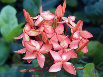 龍船花又名山丹,為茜草科常綠小灌木,花期夏、秋季,常開不敗,花瓣細(xì)小,狀如瓜子殼,但數(shù)量眾多,常常成簇成群地聚生于枝條之上,且顏色鮮紅,似一團(tuán)團(tuán)熊熊燃燒的火焰。雖然龍船花植株矮小,但它的花和葉都很漂亮,所以特別適宜庭園栽植觀賞,也可用于灌叢、林下或道路邊緣布置。