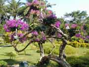 三角梅的莖干奇形怪狀、千姿百態(tài),或左右旋轉(zhuǎn),反復(fù)彎曲,或自己纏繞,打結(jié)成環(huán);枝蔓較長(zhǎng),具有銳刺,柔韌性強(qiáng),可塑性好,萌發(fā)力強(qiáng),極耐修剪,人們常將其編織后用于花架、花柱、綠廊、拱門和墻面的裝飾,或修剪成各種形狀供觀賞;老株還可用來(lái)制做樹(shù)樁盆景;生命力較強(qiáng),可扦插繁殖,又可人工嫁接,“天工不如人工巧”,如經(jīng)過(guò)人工將多個(gè)品種嫁接為一體,可形成五彩繽紛的一樹(shù)多花現(xiàn)象,極富觀賞性。