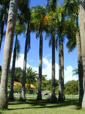 棕櫚科大喬木王棕樹形十分獨特美觀,兩頭細,中間粗,基部又膨大,象花瓶,如導彈,又似西雙版納傣族的象腳鼓。植物園中心有一片王棕,已種植多年,樹干粗壯,枝繁葉茂,遠遠望去猶如一排排面向藍天整裝待發(fā)的導彈,所以這里也常常被游人戲稱為“導彈基地”。