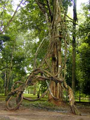 一般而言,南蛇藤可長達(dá)數(shù)十米,粗壯如臂,并往往以樹干、巖石等為依托向上攀援,待“出人頭地”后便迅速分枝長葉,爭奪陽光。在西雙版納的熱帶雨林中,它們千變?nèi)f化,千姿百態(tài),千奇百怪:或纏住樹干,螺旋式往上爬,或左右旋轉(zhuǎn),反復(fù)彎曲,或從地面斜飛上高大喬木,或從高空直墜而下,并自己纏繞,垂吊成各種環(huán)結(jié),或上穿下鉆,似神龍見首不見尾,或在不同的大樹之間來回亂竄,如猛龍過江,或在林下地面曲折纏繞,象莽蛇出洞,真是美不勝收,數(shù)不勝數(shù),令人見所未見,聞所未聞,目不暇接,眼花繚亂,不禁為之驚訝不已,嘆為觀止。