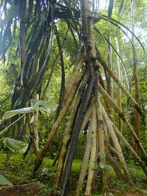 這3種植物經(jīng)過長期的磨練,早已改變了非海邊不能生長的習(xí)性,逐步適應(yīng)了熱帶雨林酸性的土壤、潮濕而較陰暗的林內(nèi)環(huán)境,也改變了種子成熟后萌發(fā)的“胎生”特性即種子落地前就在樹上萌發(fā)長根的習(xí)性。然而,也許是“江山易改而習(xí)性難移”的某一些遺傳基因還在起作用吧,它們在樹干的下部還要長出很多的氣生根并發(fā)展成為支柱根,保持它們原來生長在海濱灘涂上為了“呼吸”和支撐地上植株的習(xí)性。