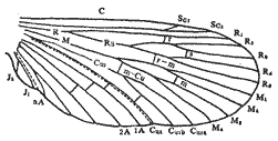 昆蟲用來飛翔的翅為膜質(zhì),翅面上有縱橫交錯的翅脈,翅脈實(shí)際上是翅面在氣管部位加厚形成的,它就像骨架一樣對翅面起著支撐、加固的作用,還與飛行時(shí)翅的扭轉(zhuǎn)運(yùn)動有關(guān)。有的昆蟲翅脈細(xì)密,如蜻蜓、蜉蝣、草蛉等。也有的翅脈稀少,如蠅類僅有幾根脈。每一類昆蟲都各有其獨(dú)特的翅脈分布型式,叫脈相(或稱脈序)。