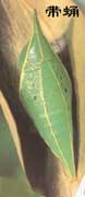 垂蛹 蝶類的蛹大多沒有特殊的保護(hù)物,常以尾端鉤著在幼蟲作成的一小塊絲墊上,頭部朝下地倒掛著,這種蛹稱垂蛹或掛蛹。蝶蛹還常以這樣的光裸蛹越冬,它們具有極強(qiáng)的抗寒能力,大多數(shù)蝶蛹有同它背景相似的保護(hù)色。 帶蛹 另一些蝶以尾端鉤著在幼蟲作成的一小塊絲墊上,頭部向上以一根細(xì)絲圍縛蛹體,維系在物體,這種蛹稱帶蛹或縊蛹。