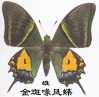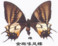 隸屬鳳蝶科。翅展8.1厘米左右。因后翅有一塊金黃色大斑故名。雌雄異型。雄蝶翅面翠綠色。前翅外緣有2條黑帶,前緣至后緣近后角處有1條黃綠色的斜帶。后翅中域有1大型金黃色斑,外緣有1根細(xì)長(zhǎng)的尾突。雌蝶前翅淡黑色,外緣帶黑色,亞外緣有1條綠色的細(xì)帶,從前緣經(jīng)中室中部到后緣有1條白色斜橫帶。后翅中域?yàn)榇笮腿榘咨,外緣?根長(zhǎng)尾突。 金斑喙鳳蝶是我國(guó)特有的世界名貴珍蝶,生活在1000米以上的闊葉、針葉常綠林帶。一年發(fā)生1代,越冬代成蟲(chóng)多在3月底4月間活動(dòng),少數(shù)可延續(xù)到8月份。分布于廣東、廣西、海南、江西、浙江、湖南、福建等地。  1988年IUCN(國(guó)際自然與自然資源保護(hù)聯(lián)盟)制定的受威脅物種紅皮目錄中列為K級(jí)保護(hù)對(duì)象。1989年我國(guó)公布的“國(guó)家野生動(dòng)物重點(diǎn)保護(hù)名錄”草案中將金斑喙鳳蝶(Teinopalpus aureus)列為一級(jí)保護(hù)對(duì)象。本種珍稀的原因也許有:1、分布地區(qū)狹窄,僅限于東洋區(qū)的局部地區(qū);2、陽(yáng)盛陰衰,雌、雄性比相差懸殊(1: 50~200);3、因?yàn)檎湎,所以蝴蝶研究者、收藏家及?ài)好者都競(jìng)相獵取,甚至有人不惜重金收購(gòu),謀利者則狂捕濫采,也是造成稀少的原因之一。
