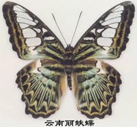 中等大小。前翅長40毫米,翅面灰綠色,自翅基部向外有縱行斜帶,前線下方至中室內(nèi)側(cè)呈棕黑色,內(nèi)有3個不規(guī)則的淡黃色斑,中室以外至外線間有白色寬帶,棕褐色的翅脈極為明顯,外線至外緣間棕黃色,內(nèi)有黑色橫紋,外緣鑲有黑白相間的緣毛;后翅基部粉綠色,中線由黑色斑點組成,外線呈放射性縱紋及三角形黑斑,外嵌淡黃色邊,外緣黑白相間,構(gòu)成極為美麗的圖案,雙翅半垂半攏時尤為美觀。分布于西南邊陲的亞熱帶地區(qū)。